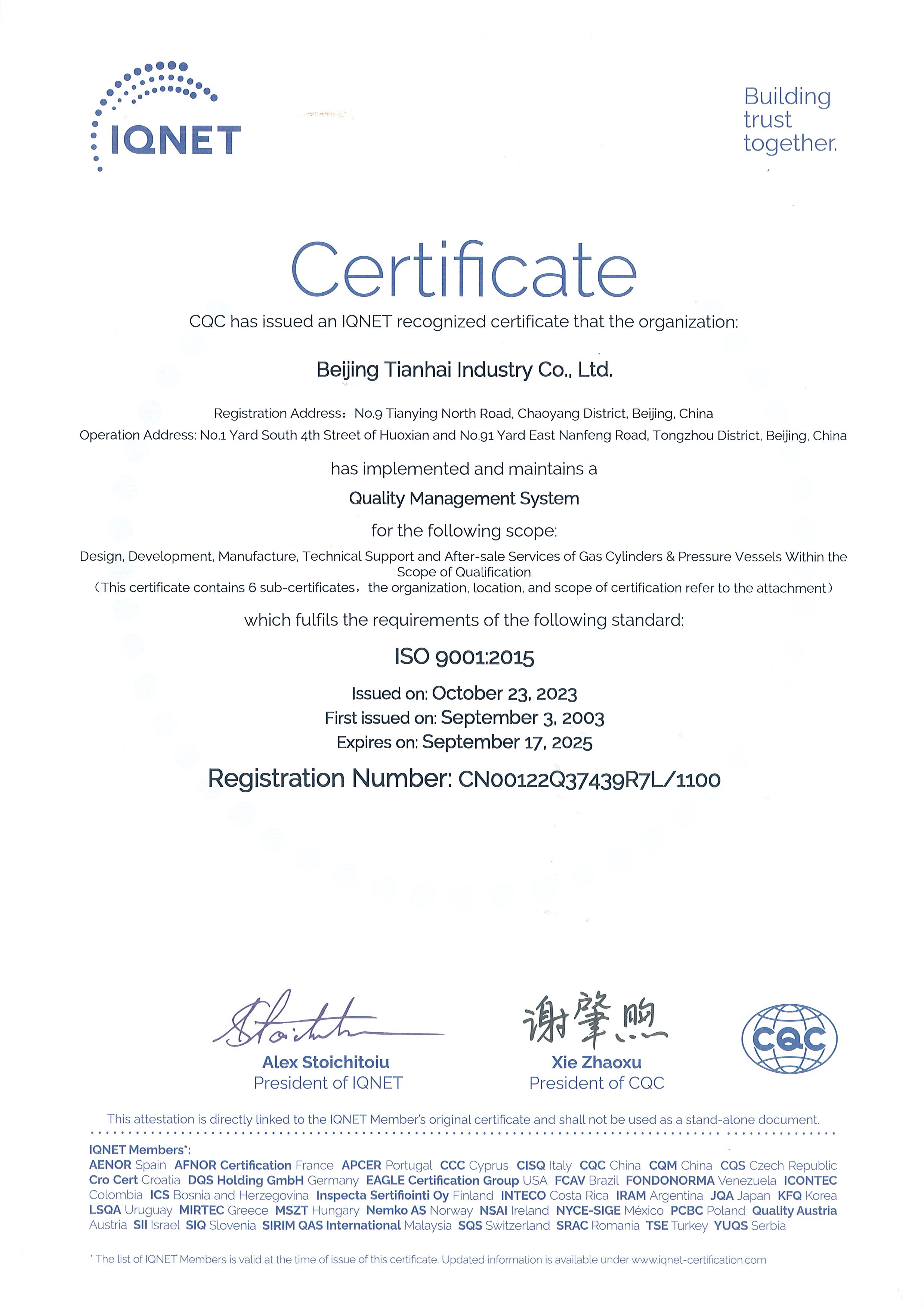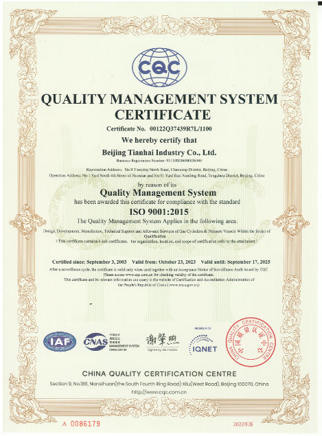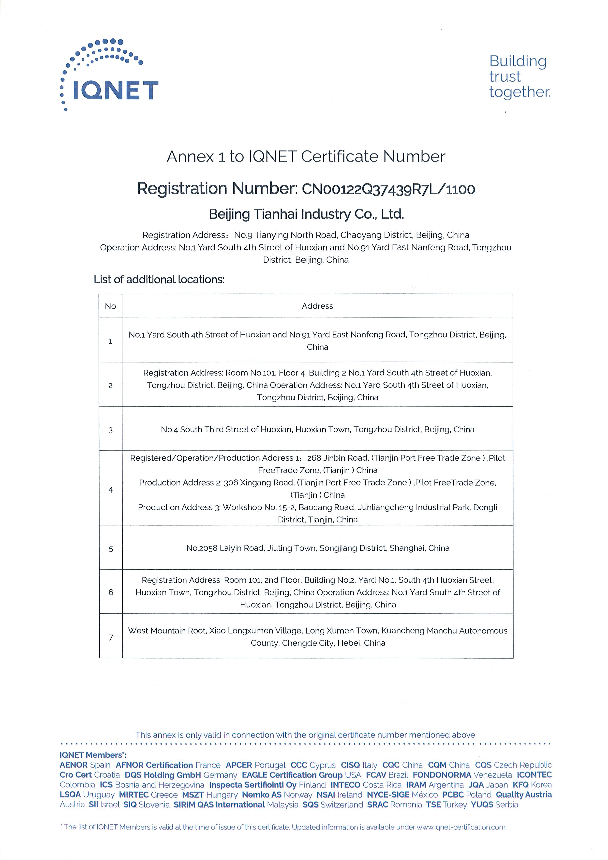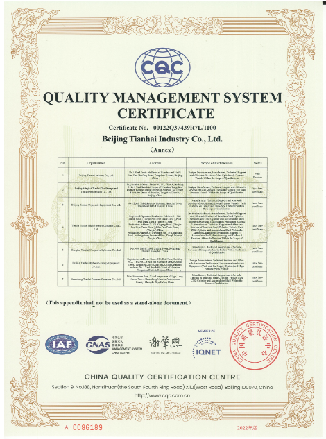 2010年9月,天海工業(yè)為保證品牌質(zhì)量,保證產(chǎn)品一致性,建立了集團一體化ISO9001質(zhì)量管理體系,通過中國質(zhì)量認證中心的集團式認證并取得證書。
