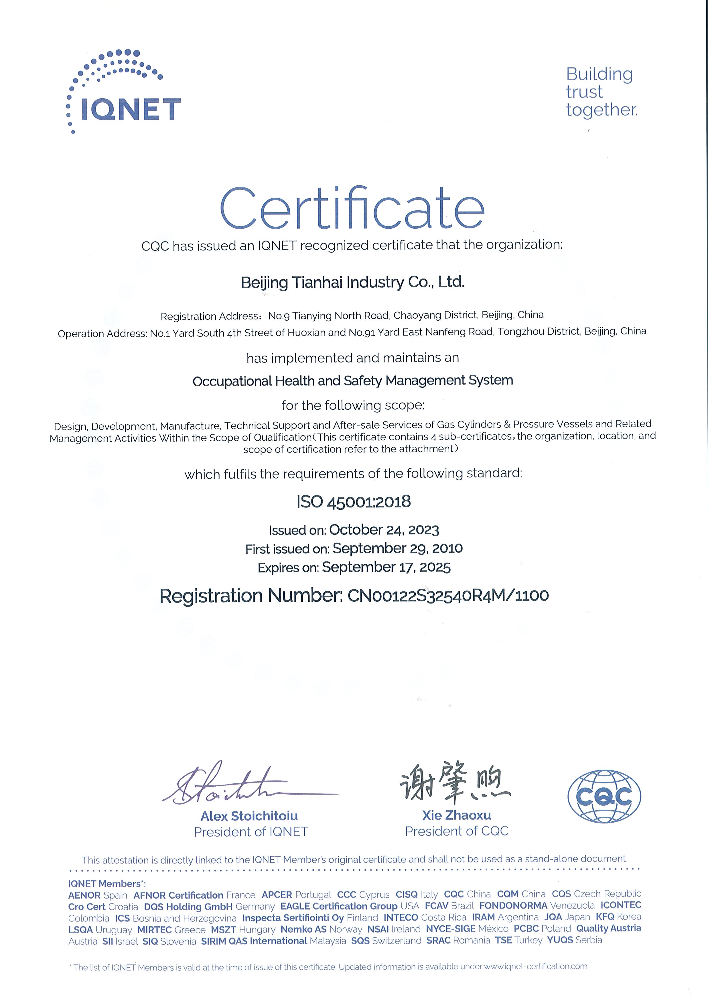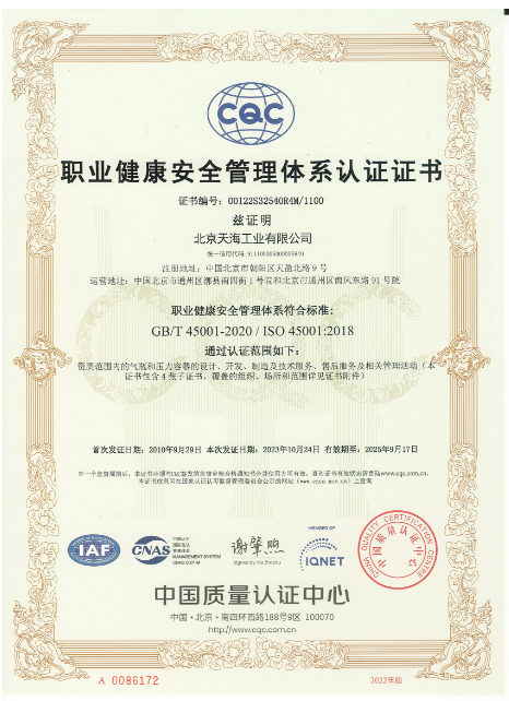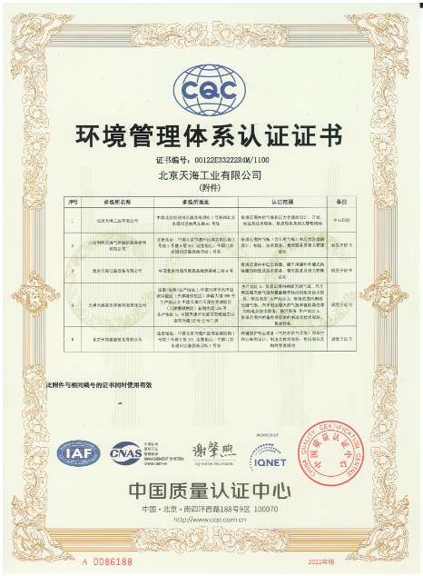 2010年-2015年,天海工業(yè)陸續(xù)建立了ISO14001和OHSAS18001環(huán)境和職業(yè)健康安全管理體系,整合了天海工業(yè)“三體系”,通過中國質(zhì)量認證中心的認證并取得證書。